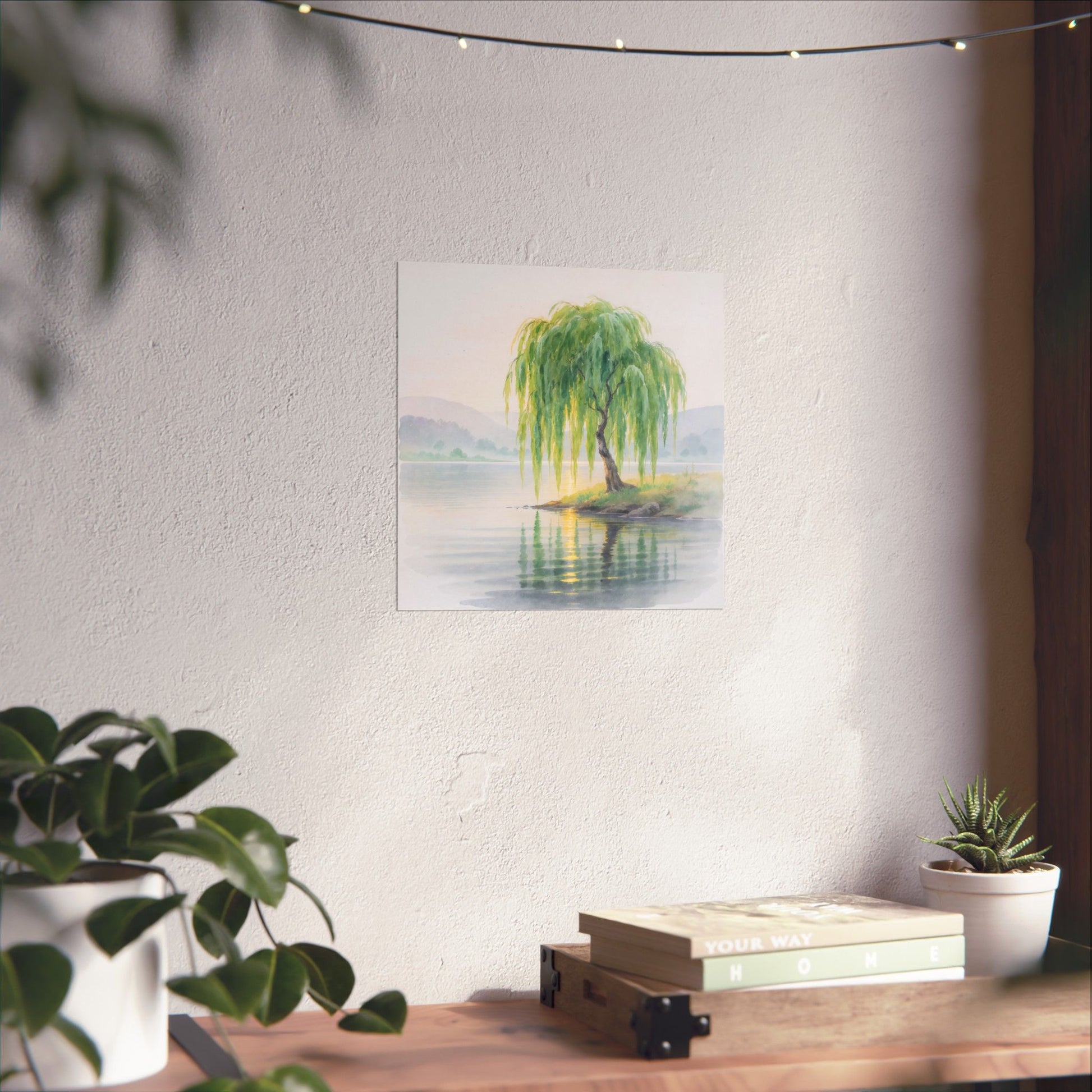 Vintage Willow Tree Watercolor Poster — Serene Lake Matte Vertical Art Print